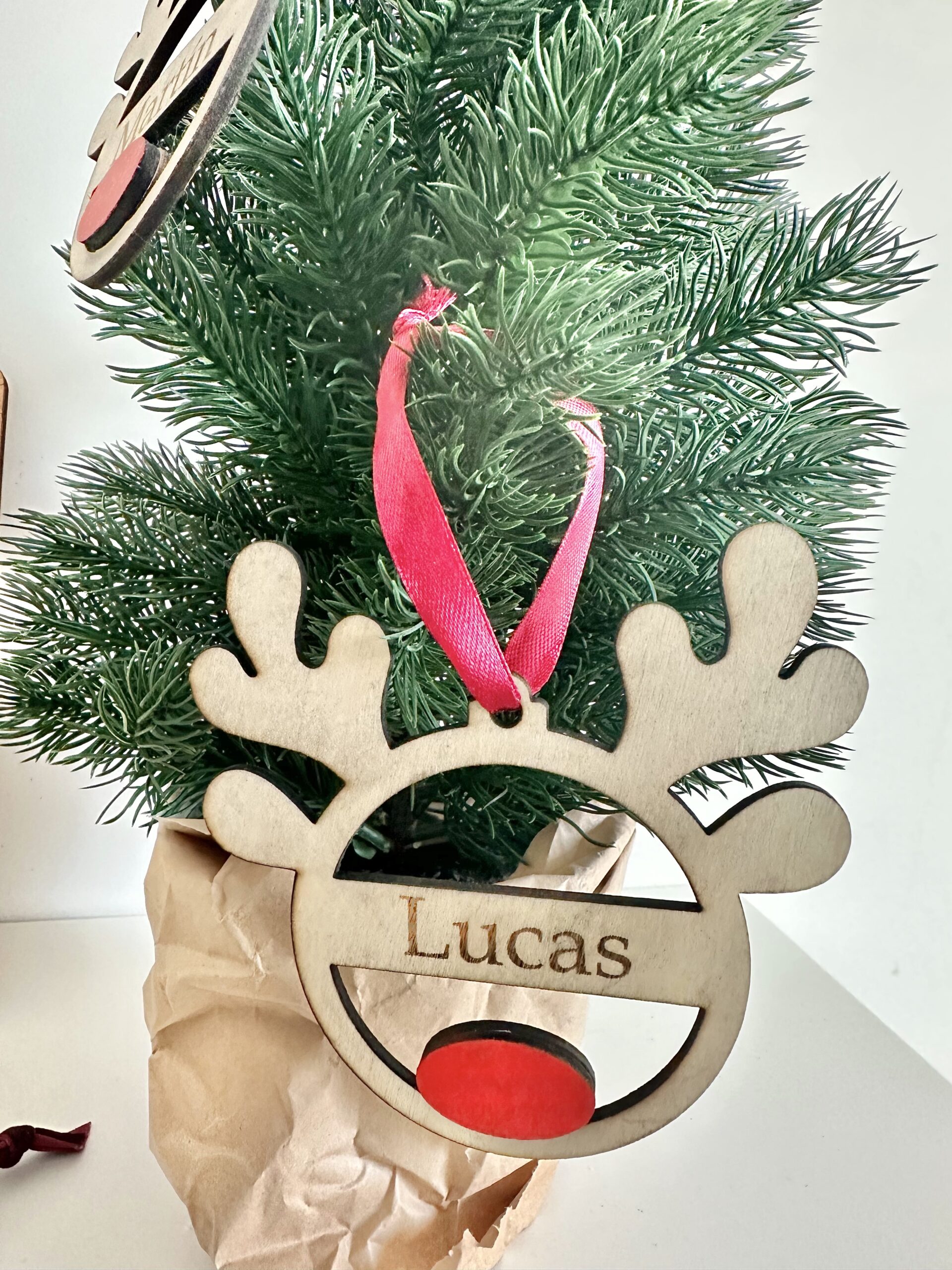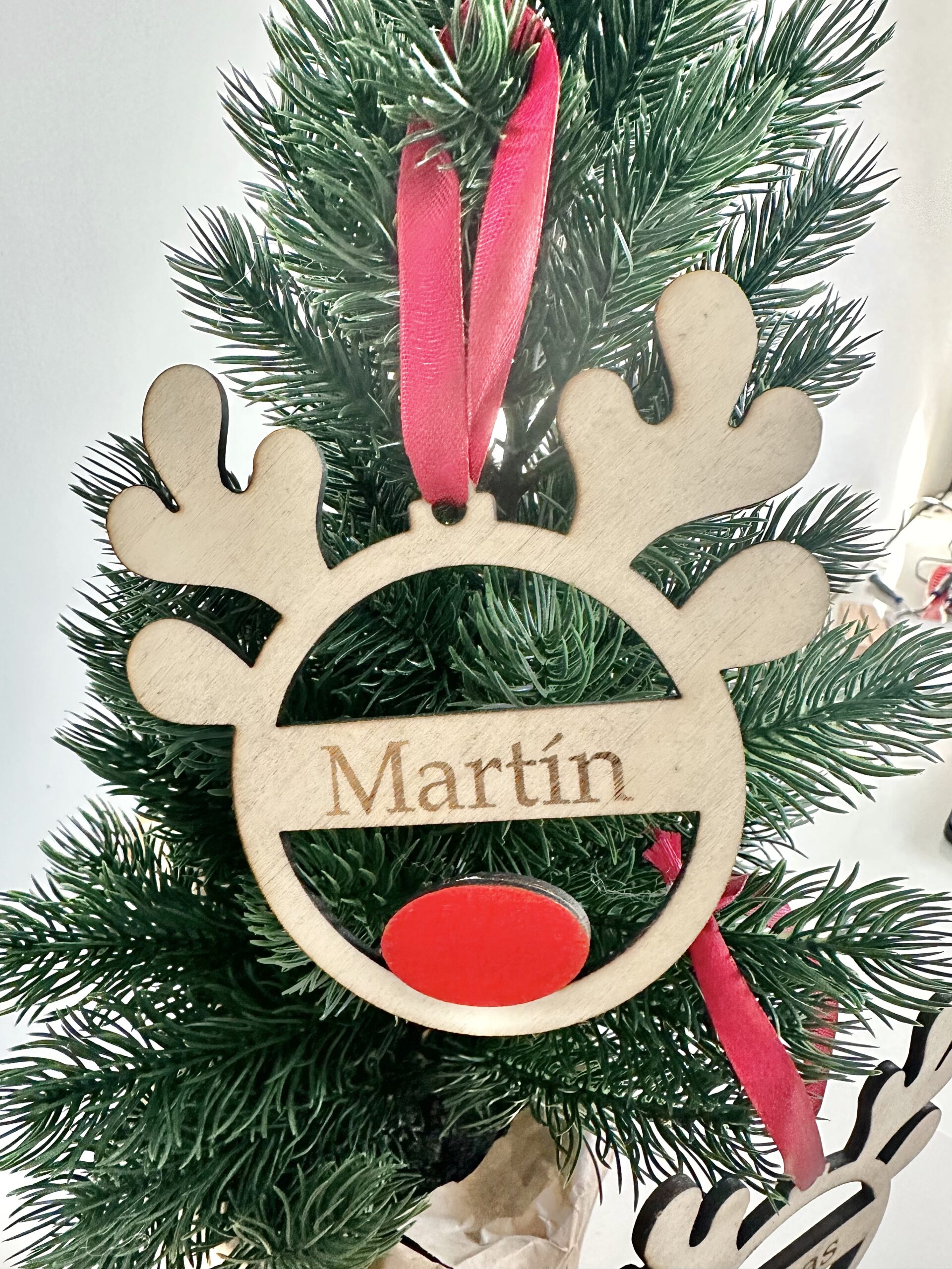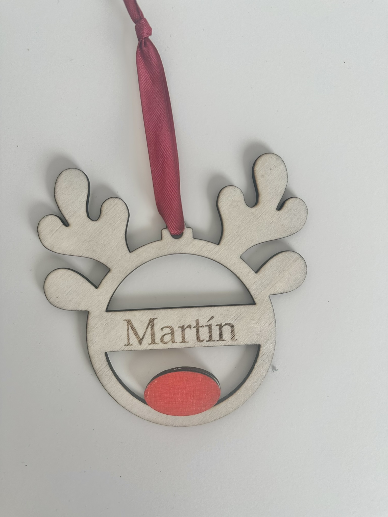 Bola de navidad con la forma de un reno, personalízala con el nombre de tu peque.