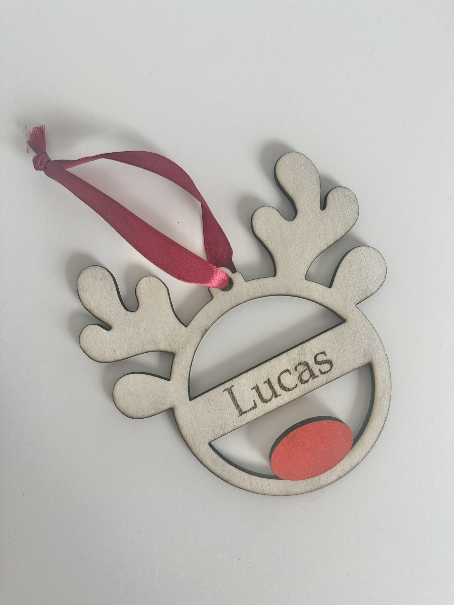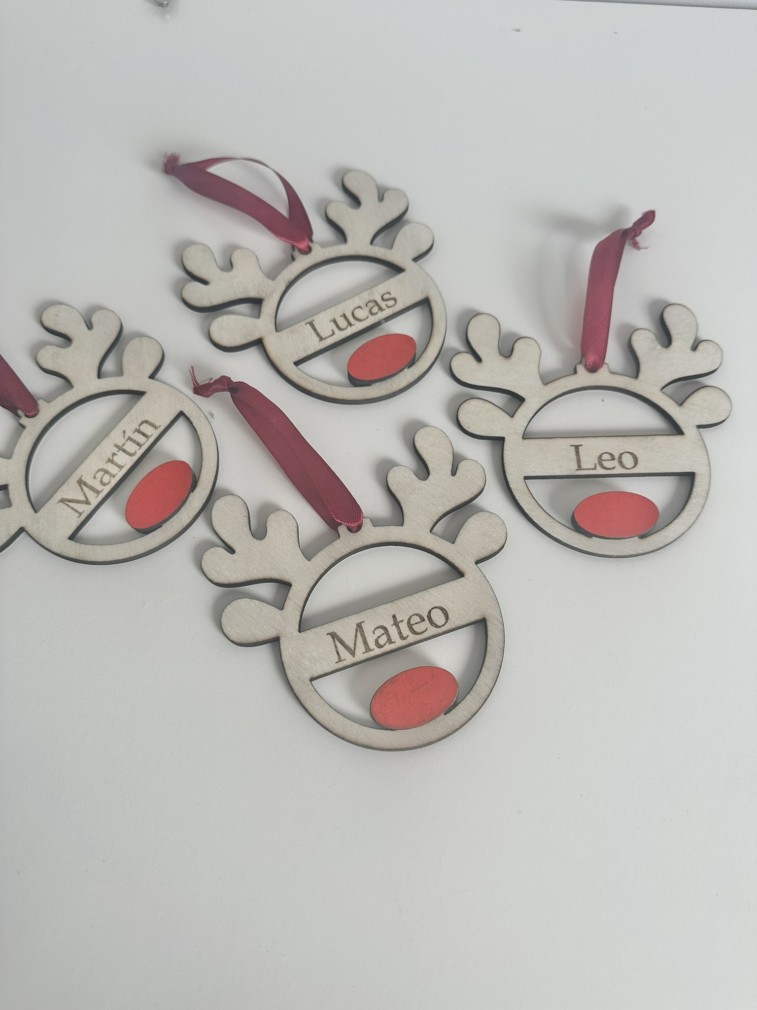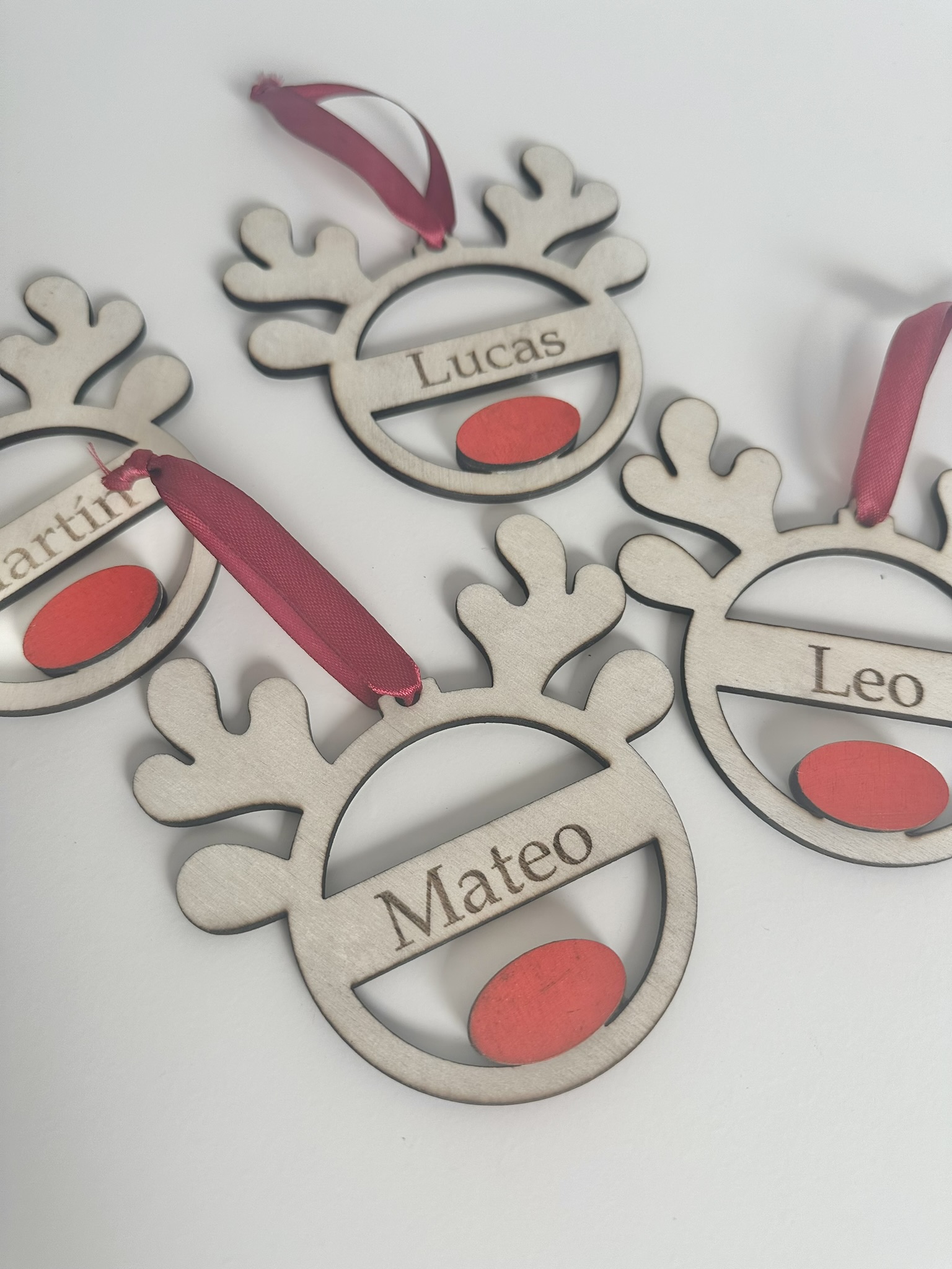 Bola de navidad realizada en madera con la forma de un reno, personalízala con el nombre de tu peque.